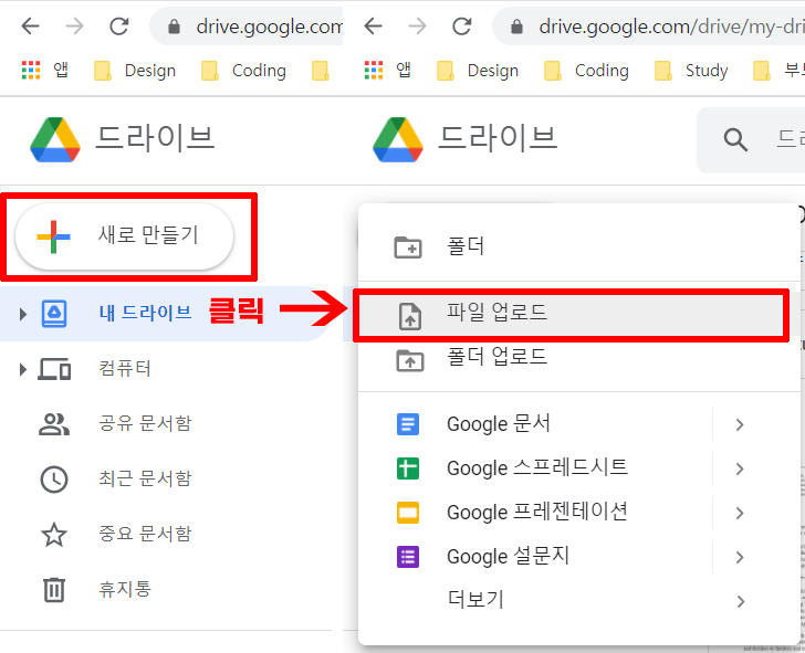방법 1. 드라이브 화면 좌측(메뉴) 영역에서 새로 만들기 > 파일 업로드를 클릭하여 업로드
