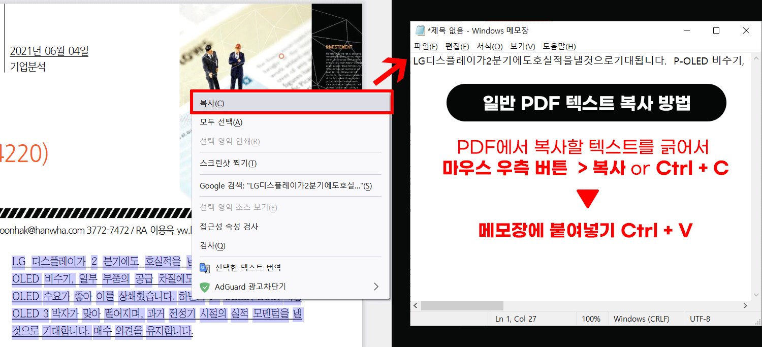 다들 알다시피 보통의 PDF 파일에서는 복사할 텍스트를 긁어서 Ctrl + C / Ctrl + V를 하면 쉽게 복사/붙여 넣기가 된다.