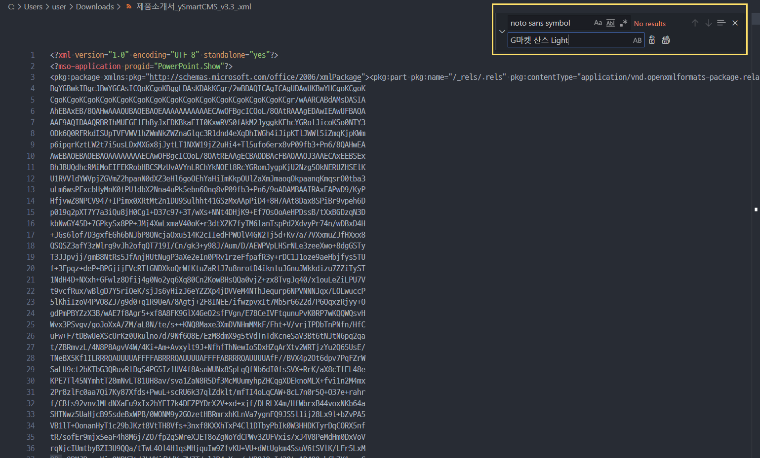 2단계. xml로 저장한 파일을 에디터(혹은 메모장)로 열어서 전체 글꼴 변경 후 저장