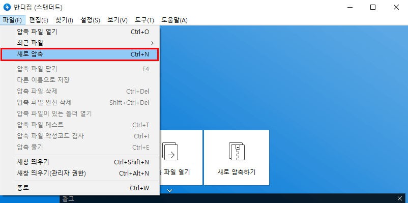 1단계. 반디집 메뉴 중 파일 > 새로 압축 또는 Ctrl + N을 클릭