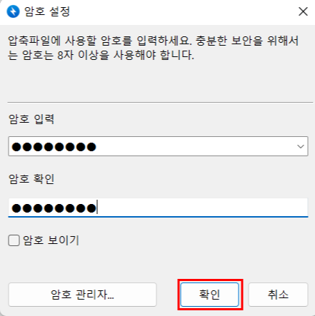 암호 설정 화면에서 비밀번호를 동일하게 입력 후 '확인' 버튼을 눌러주면, 지정한 경로에 암호 설정된 7Z파일이 저장된다.