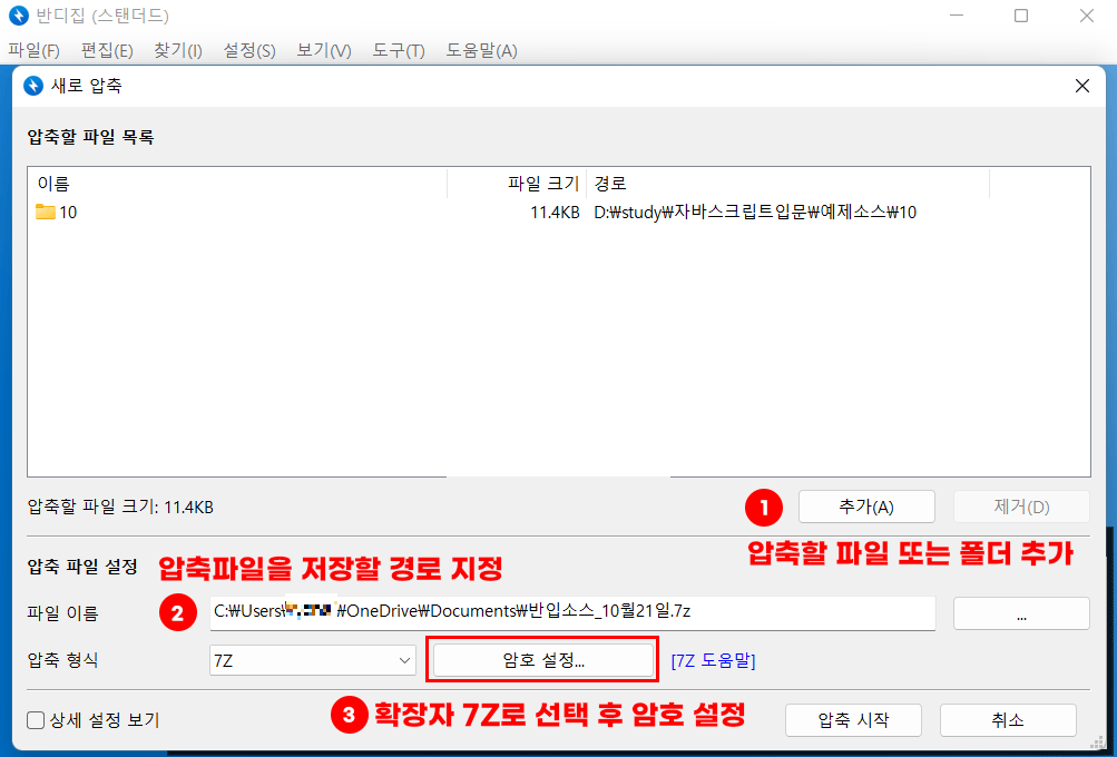 반디집에서 압축할 파일이나 폴더를 추가하고, 압축 형식을 7Z로 선택 후 저장 경로 및 파일명을 지정해 준다.