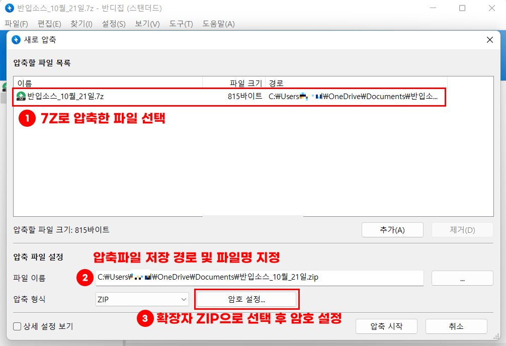 마지막으로 2단계에서 저장한 7Z파일을 ZIP 파일로 암호 설정하여 다시 한번 더 저장해 주면 된다.