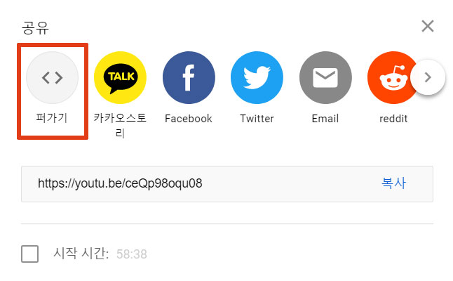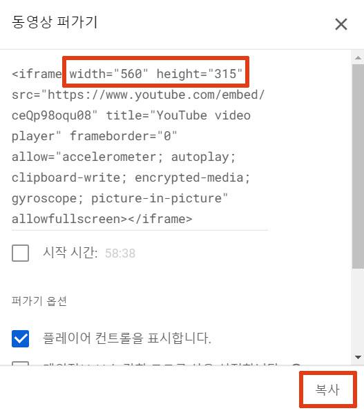 동영상 퍼가기 창 우측 하단에 있는 '복사' 버튼을 클릭하면 상단에 있는 iframe 소스가 복사된다.