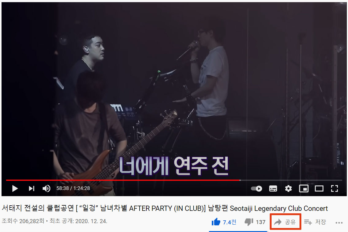 유튜브에서 퍼올 동영상의 우측 하단에 있는 '공유' 버튼을 클릭한다. (필자가 좋아하는 서태지 공연 동영상으로 예시를 들겠다😆)